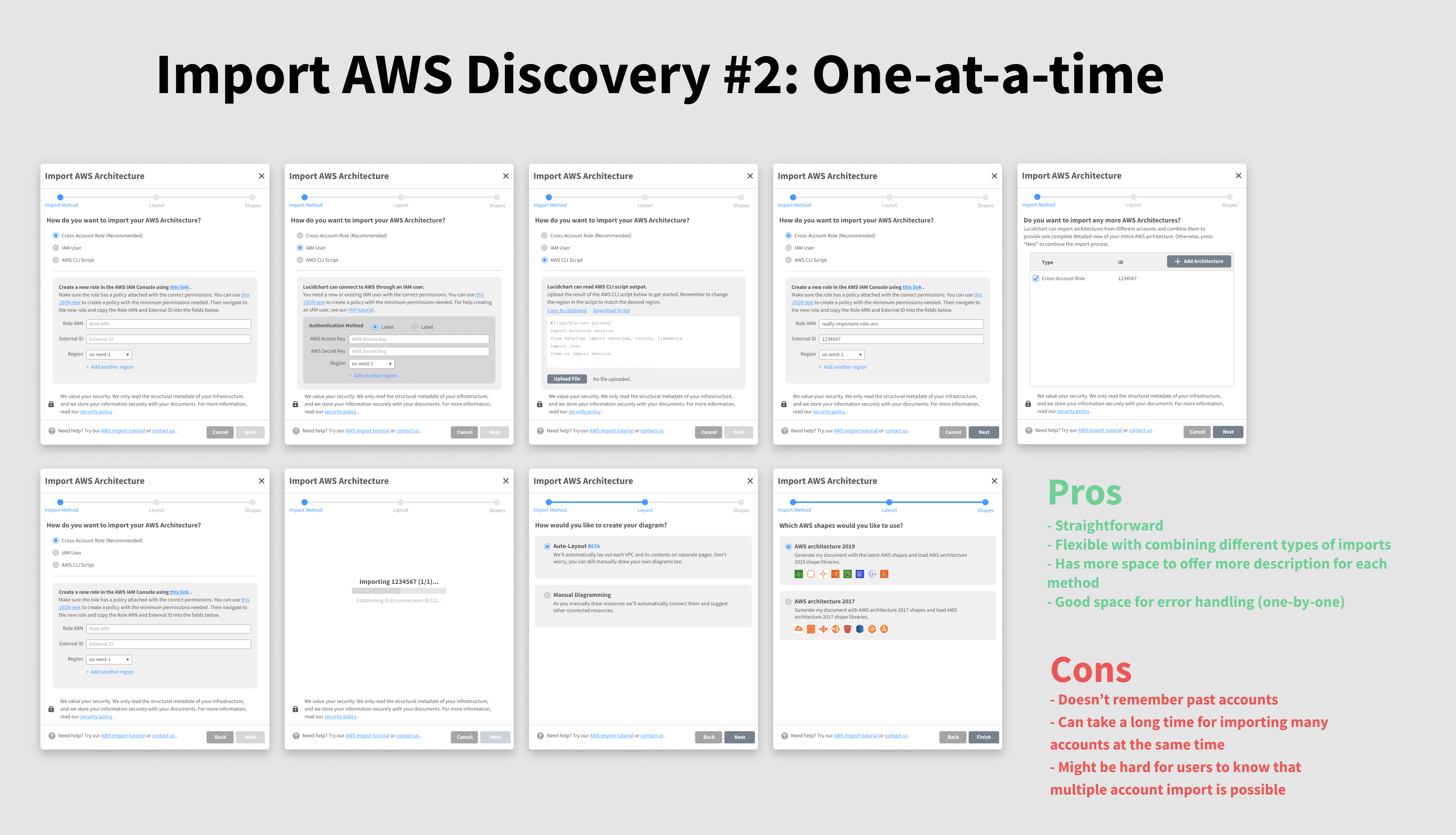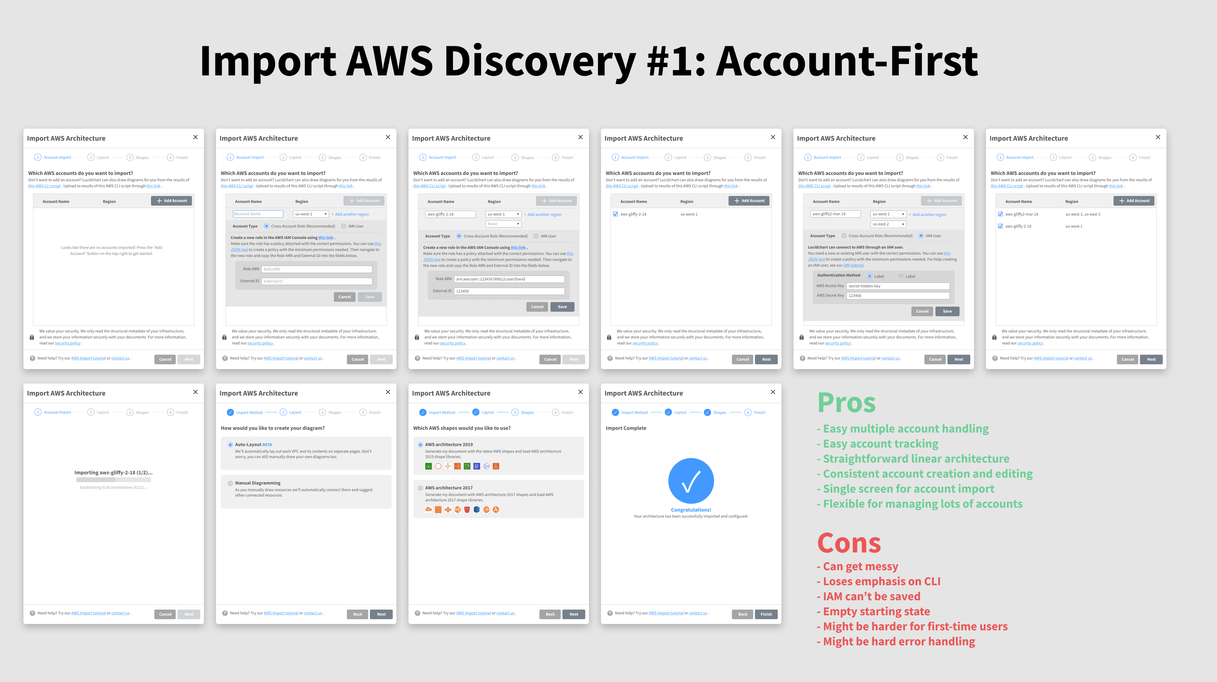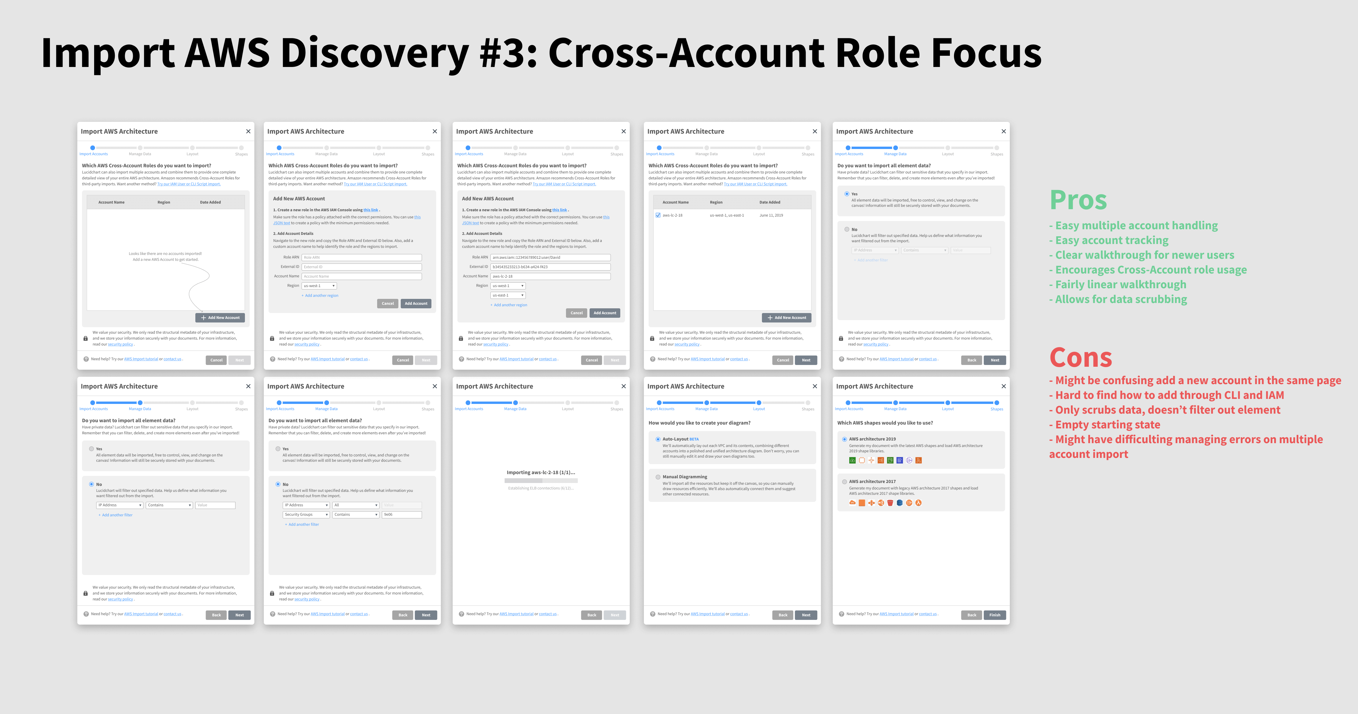 Focuses on cross-account roles, the most popular import type. Has lots of potential in a more fluid flow, but also is hard for the user to understand that they’re adding accounts to a queue due to poor visibility.