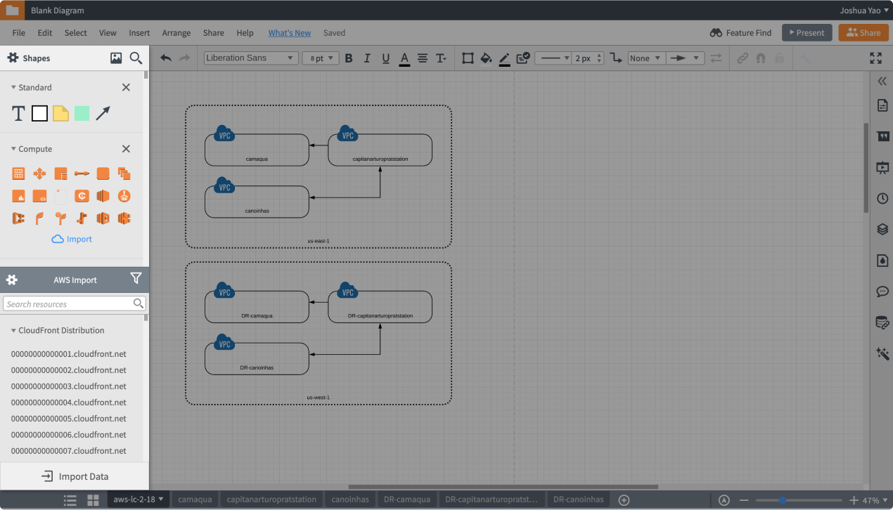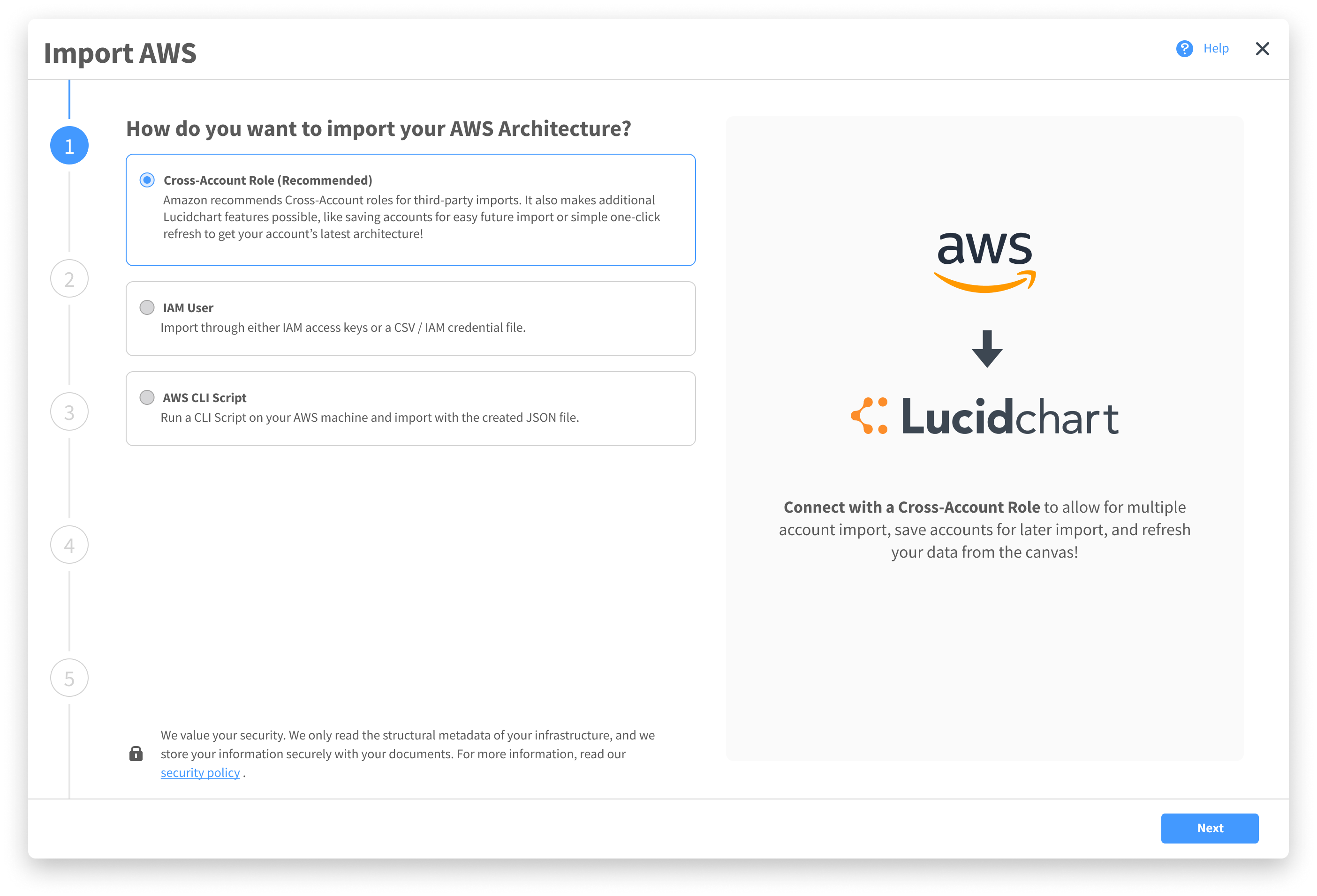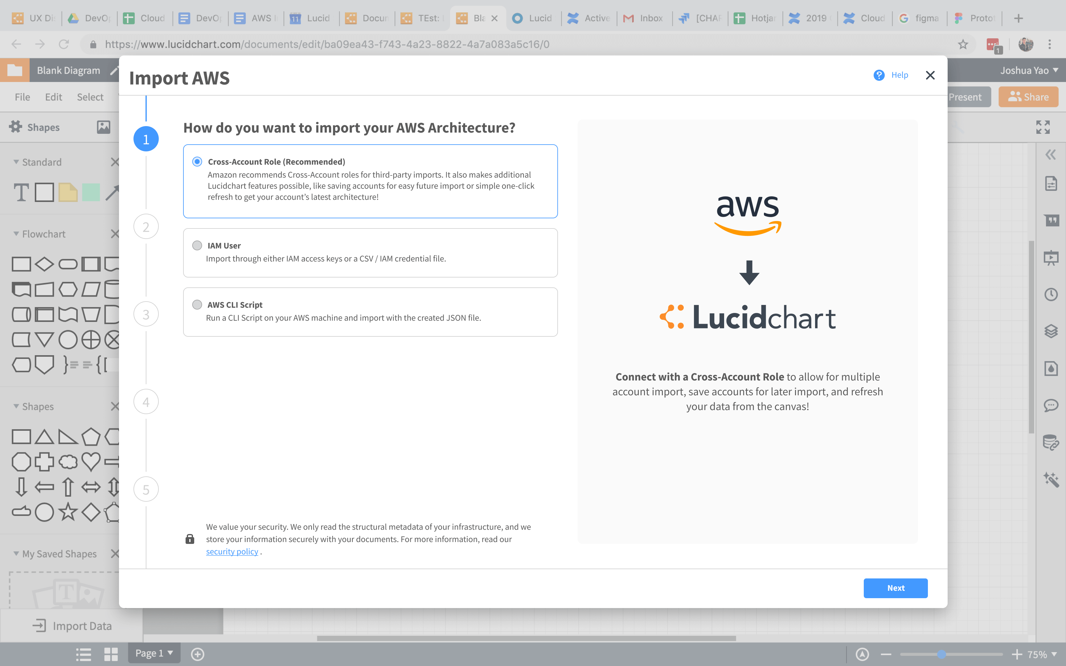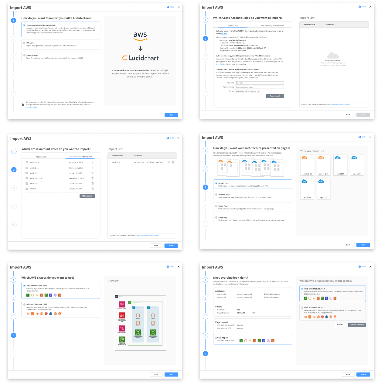 For this project, I was the sole designer on a scrum team working within a 2-week sprint cycle. My team consisted of myself, a product manager, five engineers, and a QA specialist. I was responsible for designing the experience around the import of Amazon Web Services (AWS) cloud architectures into Lucidchart, ranging from how users import the architecture and how they can interact with the diagram on the canvas.
