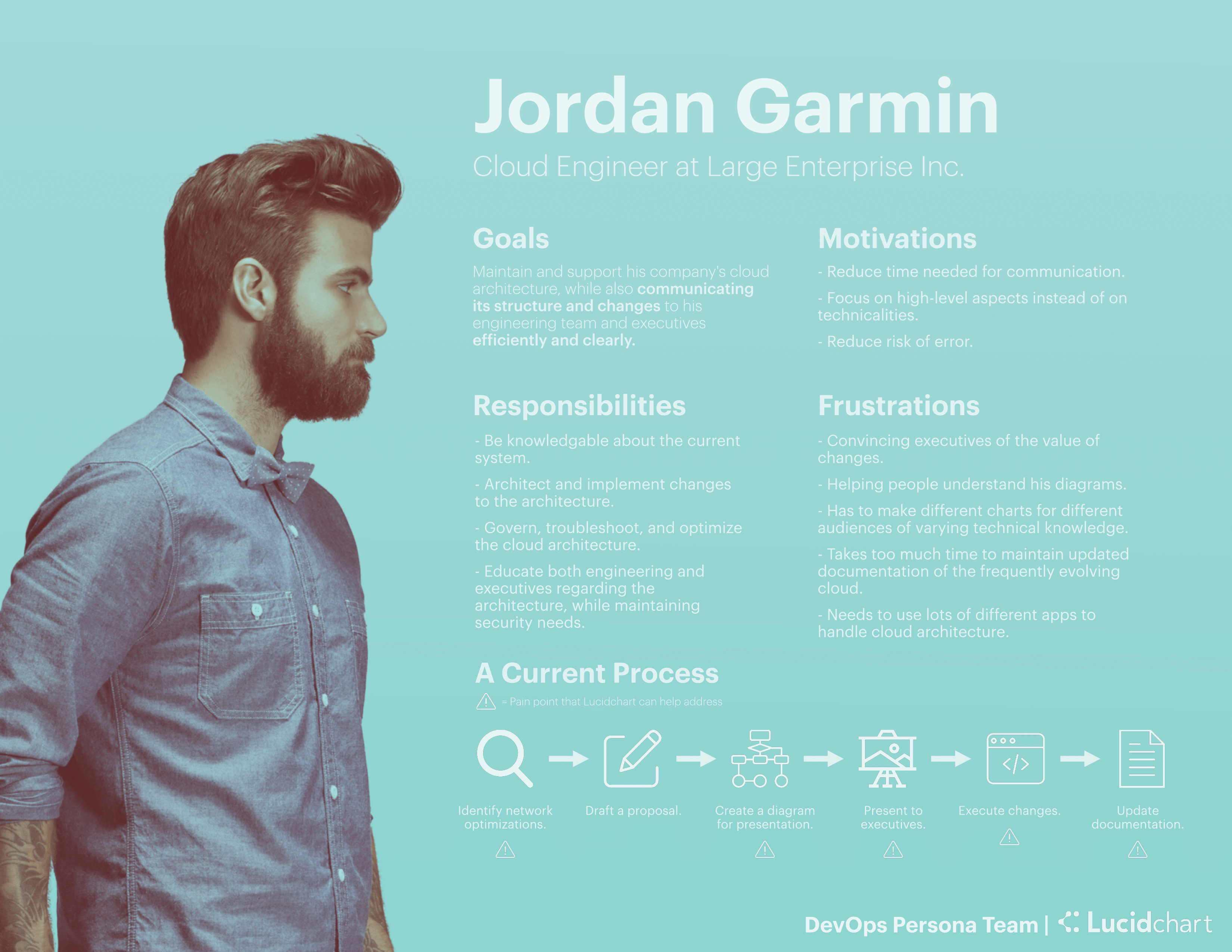 Directly responsible for his company’s cloud, Jordan governs and makes changes to his cloud while communicating changes to other engineers and executives clearly and efficiently. He wants to keep errors low and everything clearly documented. Some jobs to be done (JTBD) include creating diagrams for presentations, analyzing the current infrastructure, and updating documentation.