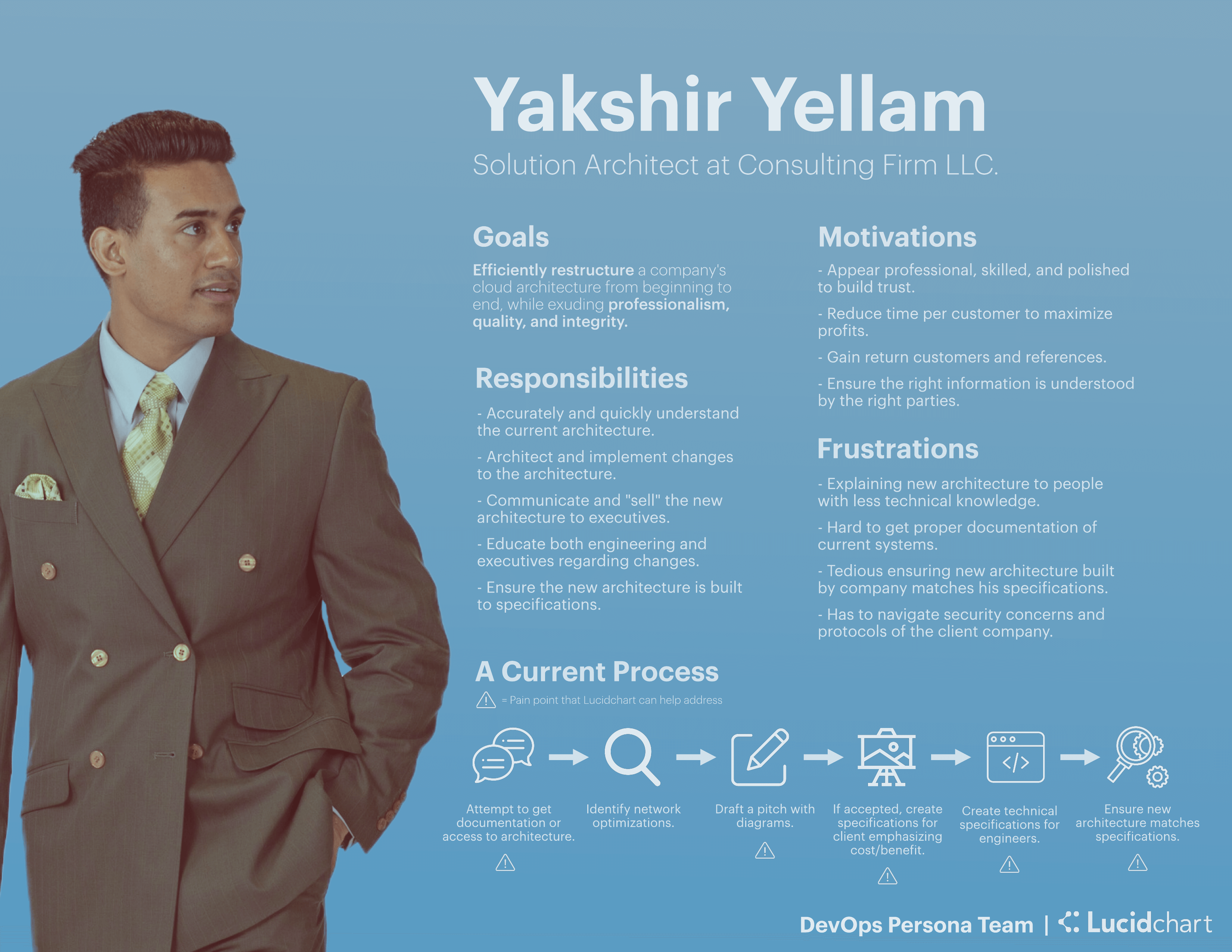 Yakshir works at a consulting firm for building and optimizing companies’ clouds. While exuding professionalism and quality, he wants to efficiently restructure a cloud with proper documentation so it can be handed off easily. Some JTBD include quickly understanding the architecture, drafting and visualizing changes, and ensuring that changes match specifications.