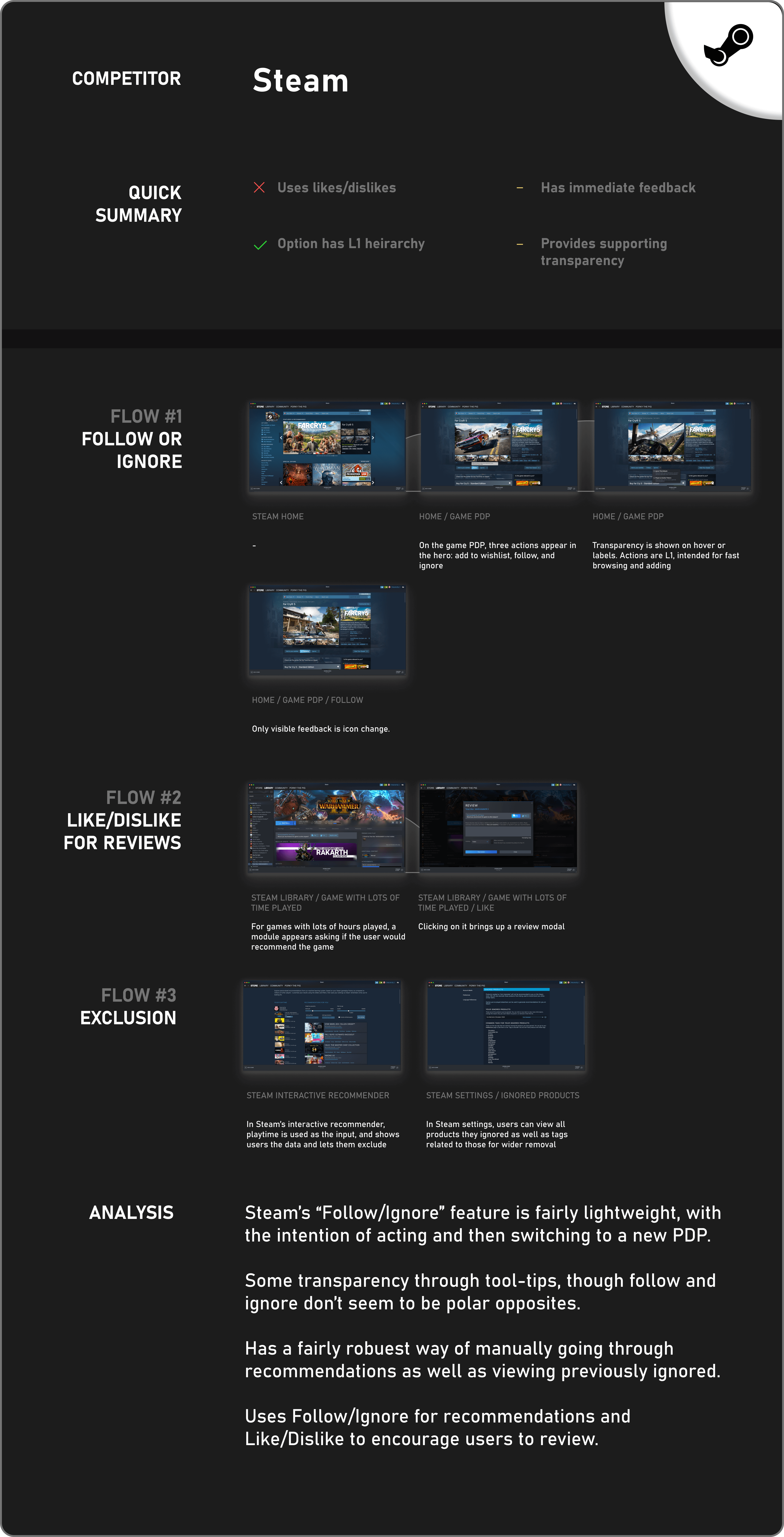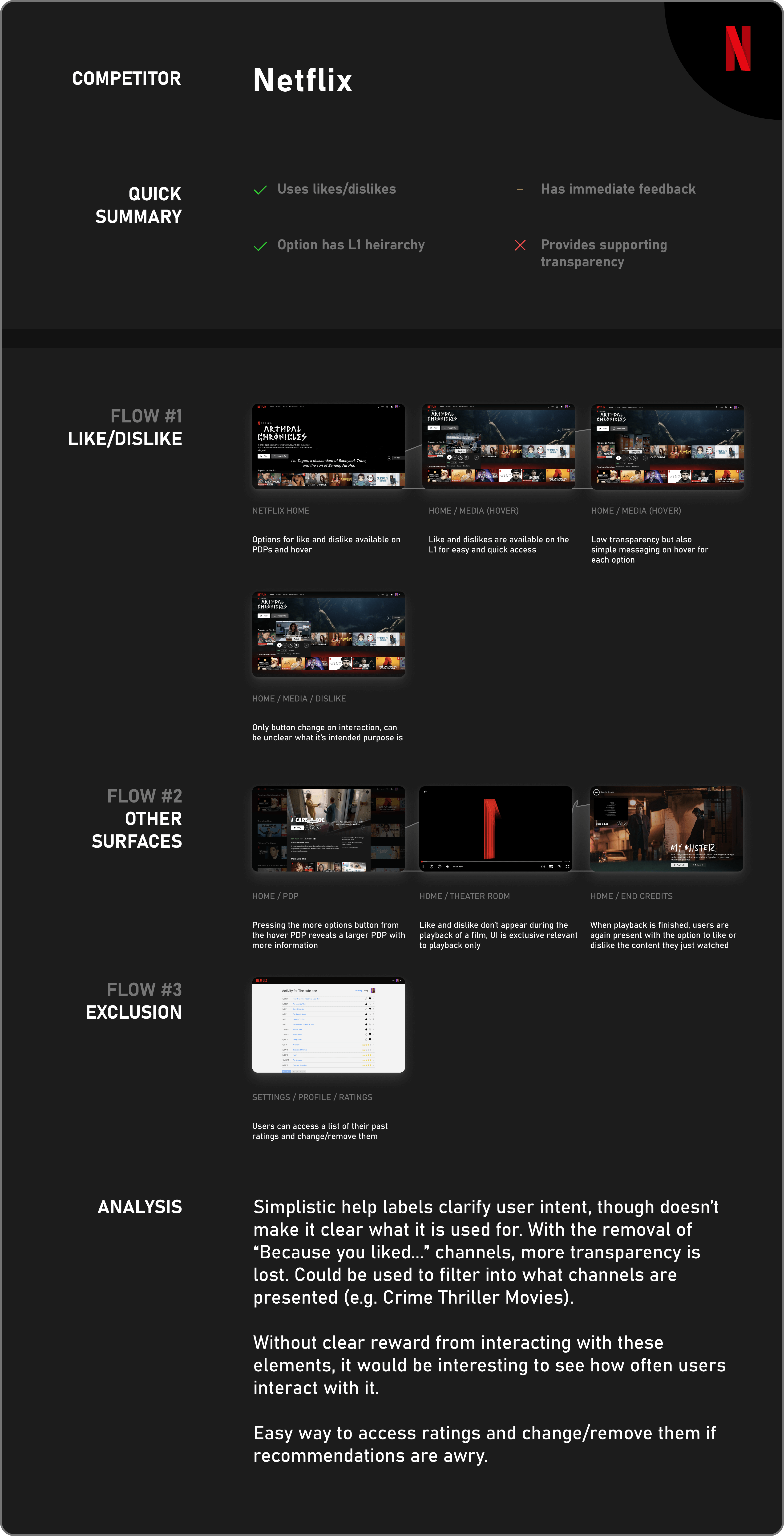 To get a wider sense of how explicit user personalization was commonly gathered, I conducted competitive analysis on products that used a form of likes/dislikes to parse user interests and help them explore.